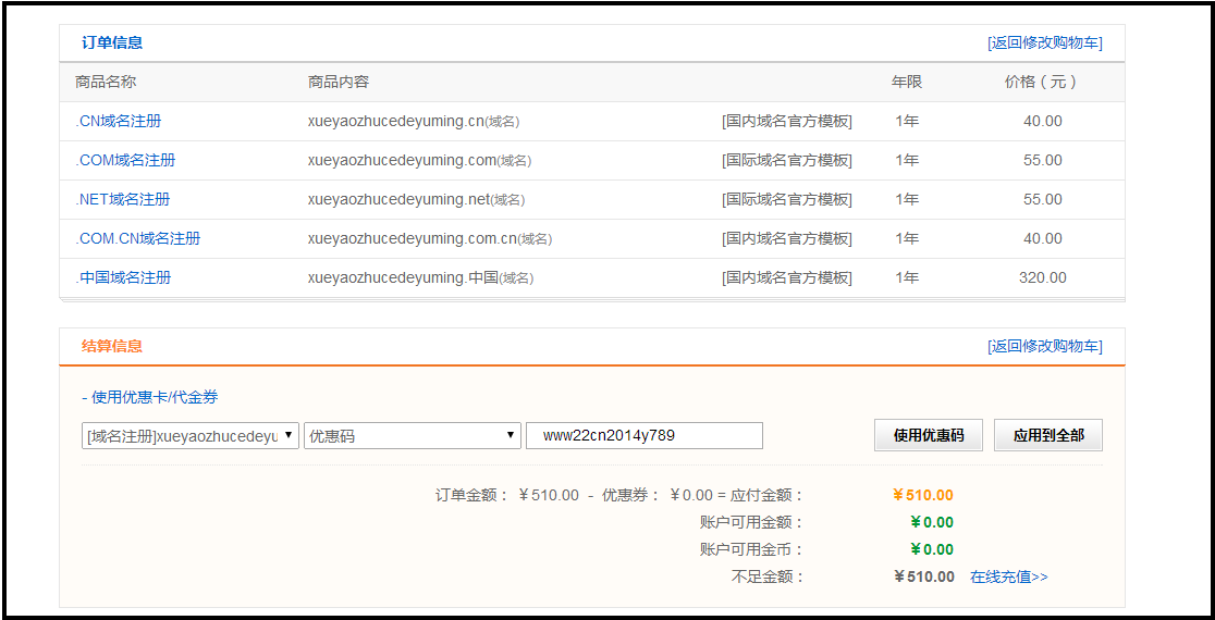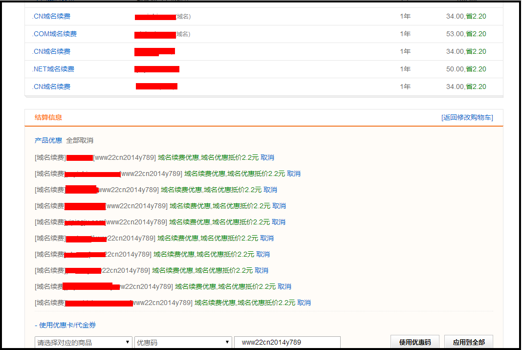 当优惠码只适用一个域名的时候,虽然图中有2个cn域名,但优惠码只能使用到一个域名, 即使点击了 应用到全部 也只有一个域名有优惠信息