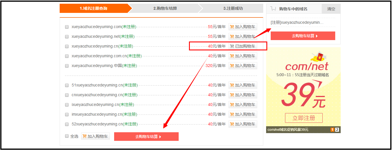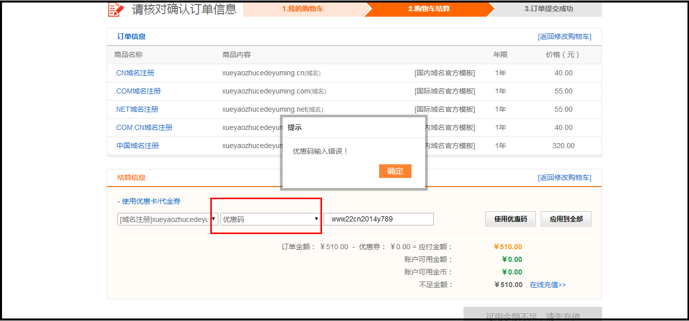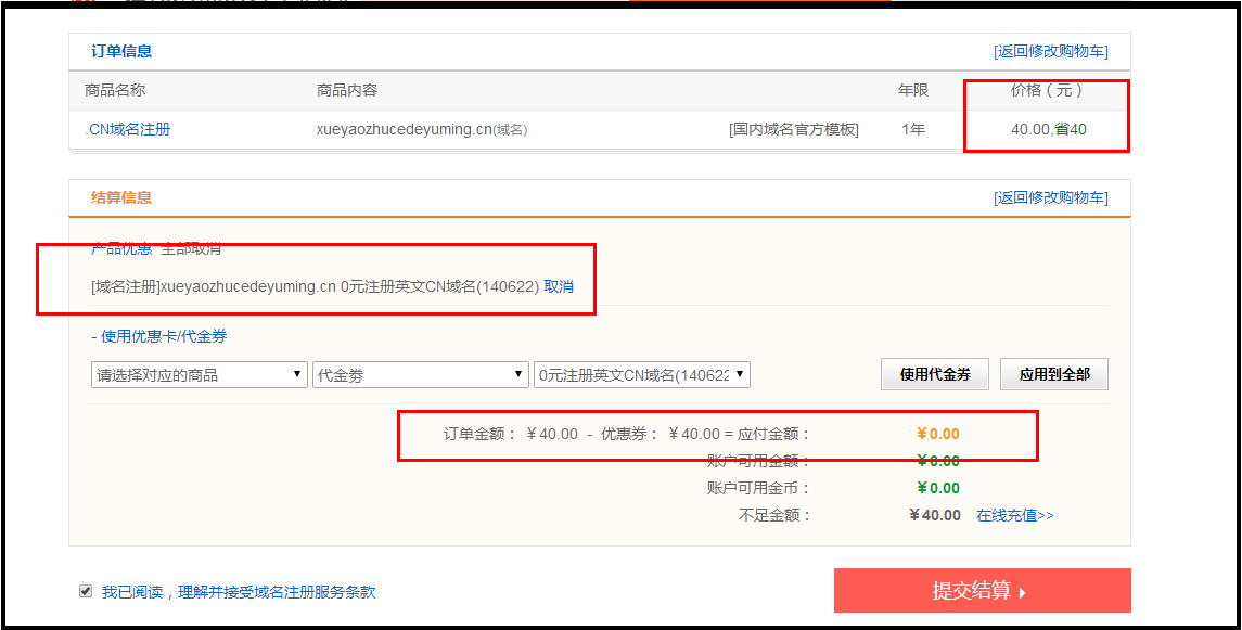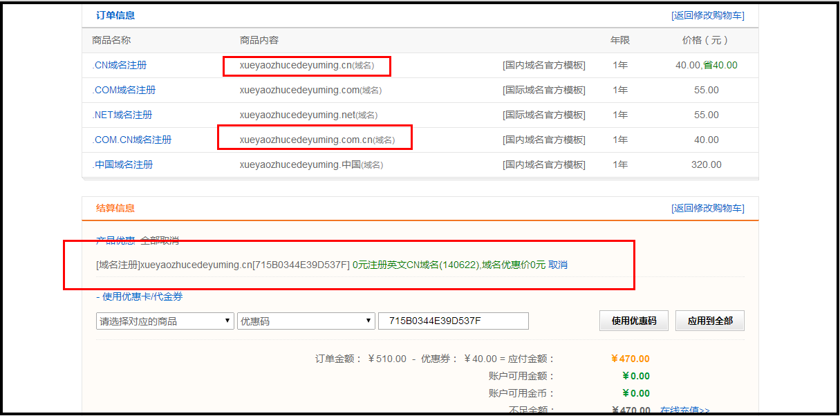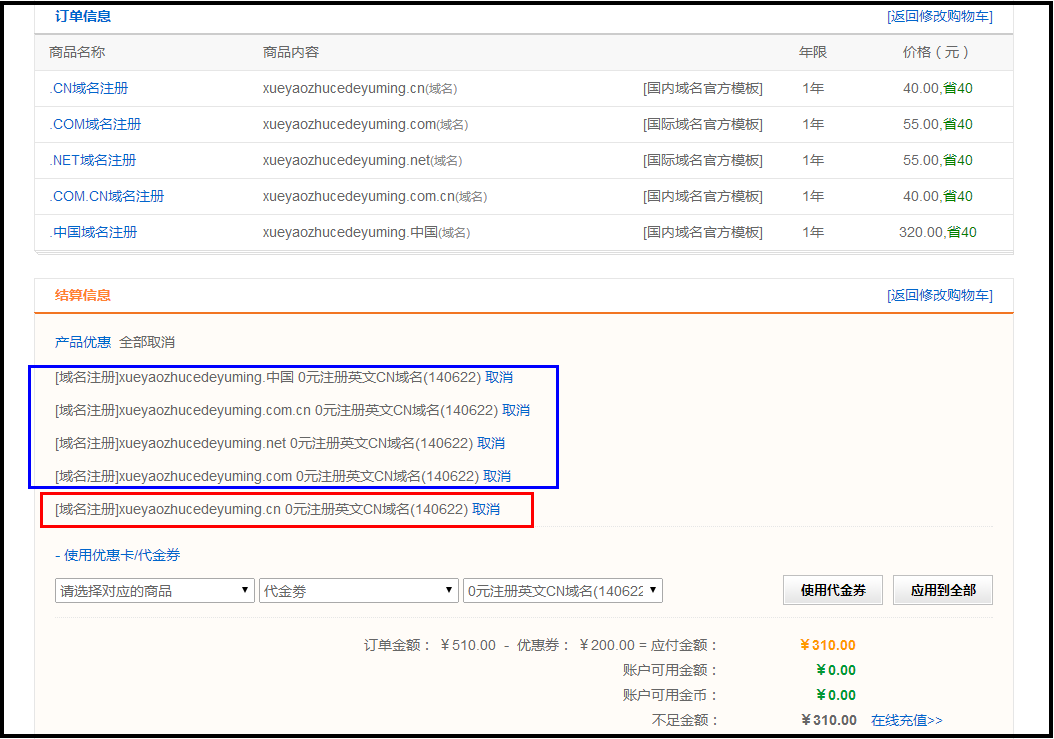 注意:这时候虽然 都选择了使用代金券 [0元注册英文CN域名] ,但正真能够使用的,只有红色框中的域名,蓝色框中域名为无效使用注册将提示 优惠码或代金券错误