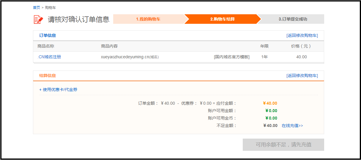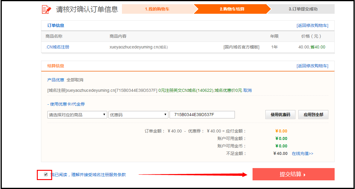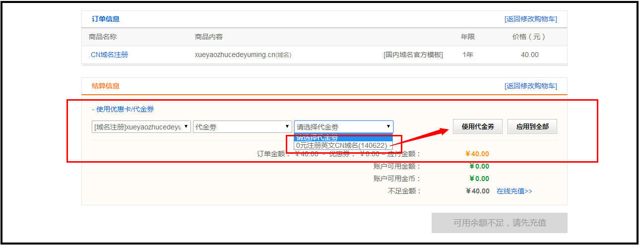 4.使用代金券:如果您有代金券或优惠码,可点击使用优惠卡代金券选择对应的域名优惠类型