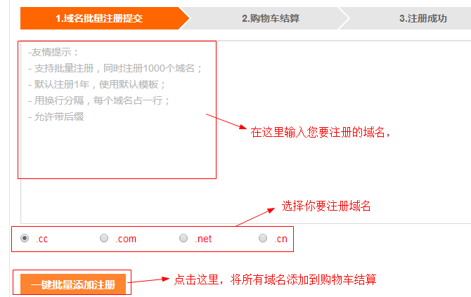 第二步,点击“一键批量添加注册”按钮,即可将您要注册的域名添加到购物车进行结算。