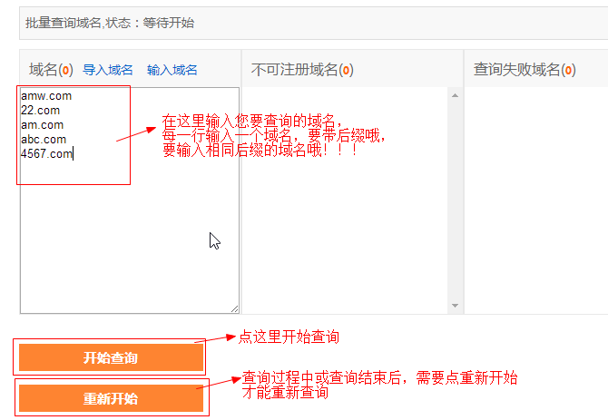 这里说明一下输入域名,如图,输入域名时,需要是同一后缀的域名,每行输入一个域名;如有多个不同后缀的域名,默认只查询其中一种后缀。