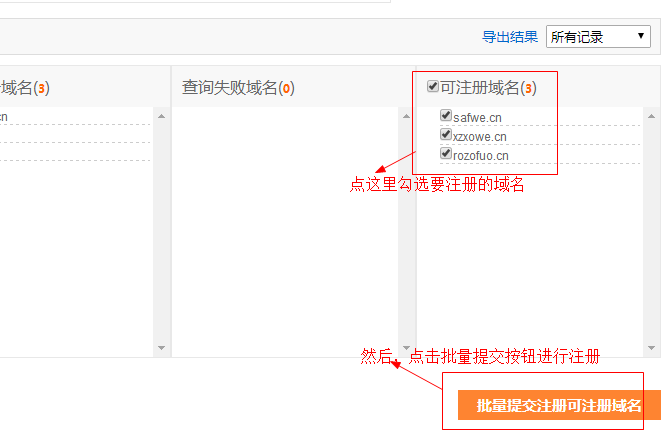 第三步,如图所示,在查询结果中,勾选您要注册的域名,点击批量提交注册的按钮。